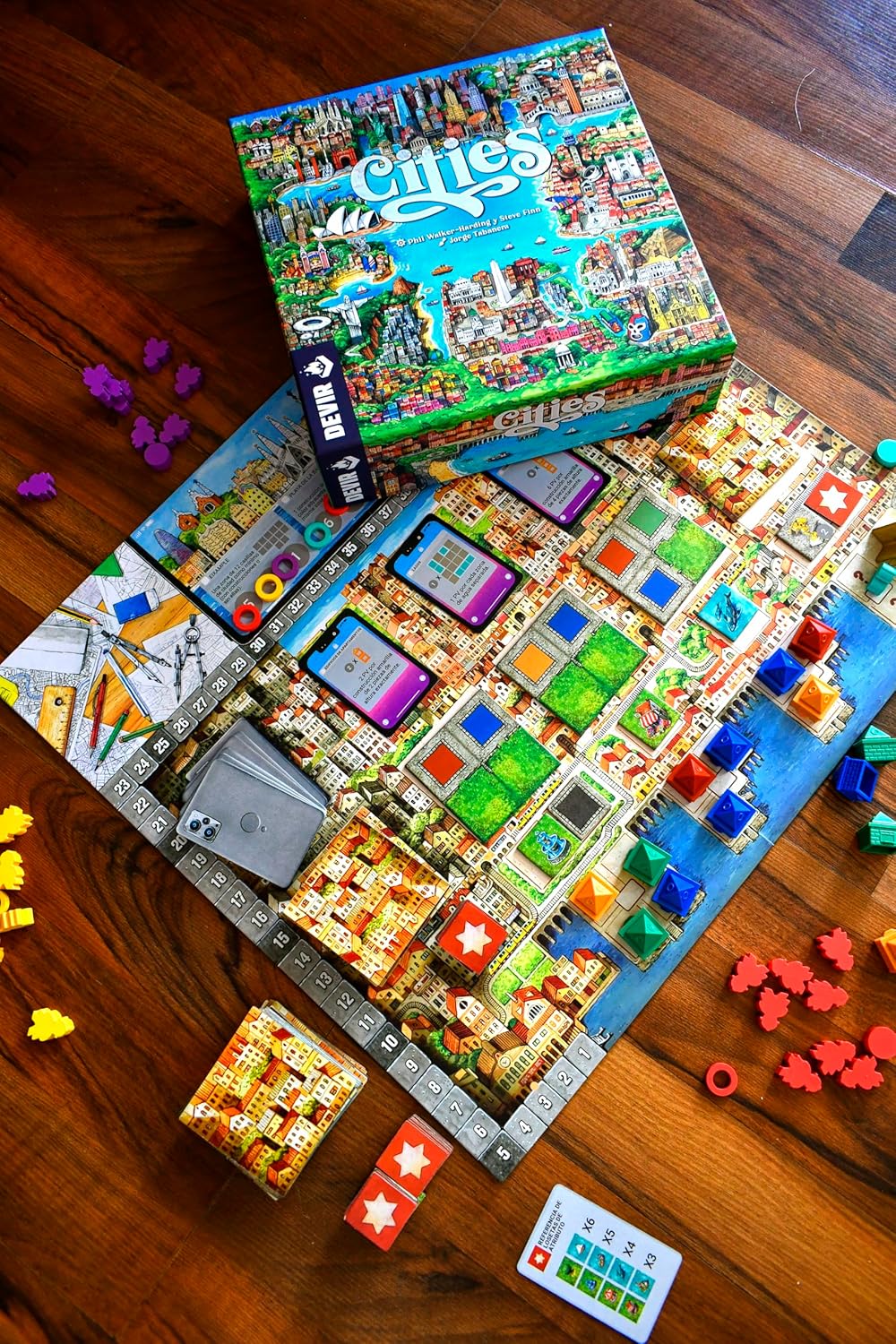 - La caja de Cities viene repleta de componentes para que la experiencia de juego sea lo más inmersiva posible: 100 piezas de construcción de distintos colores, 32 peones de trabajador, 12 anillos de logro, más de 100 losetas… Todas las herramientas necesarias para crear el mejor plan urbanístico para tu barrio