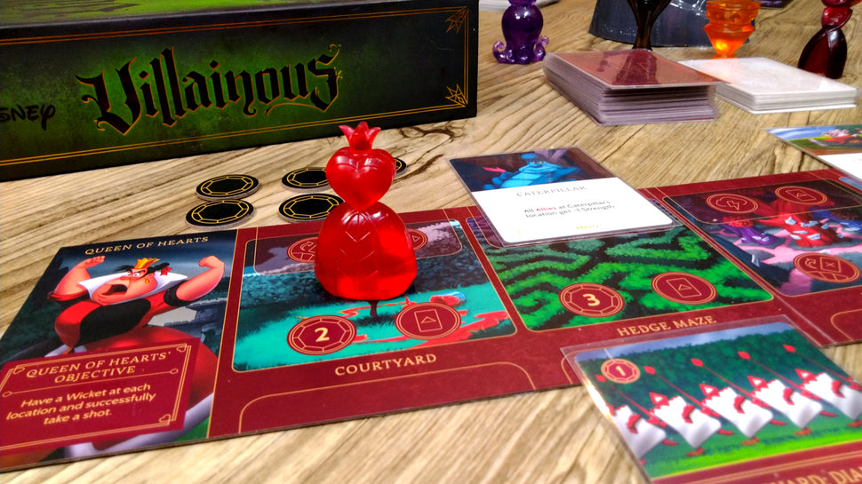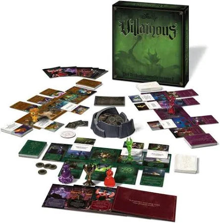 Métete en el papel de uno de los seis malvados personajes Disney (Maléfica, Úrsula, Jafar, Príncipe Juan, Reina de Corazones, Capitán Garfio). Cada Villano tiene un peón que recuerda a su aspecto físico y un reino donde actúa y juega. Logra tu maléfico plan consiguiendo monedas y desafiando a la suerte. Las Cartas de Destino te permitirán combatir a tus oponentes ¡y arruinar los objetivos de los otros personajes Disney!