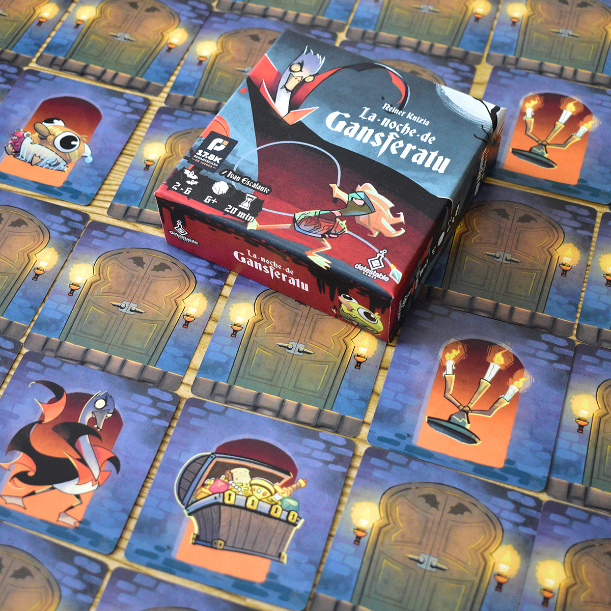 En La Noche de Gangsferatu te adentrarás en un castillo tenebroso repleto de tesoros, aldeanos perdidos y criaturas oscuras. Como valiente cazavampiros, deberás tentar a la suerte revelando cartas en una cuadrícula misteriosa. Pero cuidado, que Gangsferatu y sus Murciegansos te acechan en cada rincón.