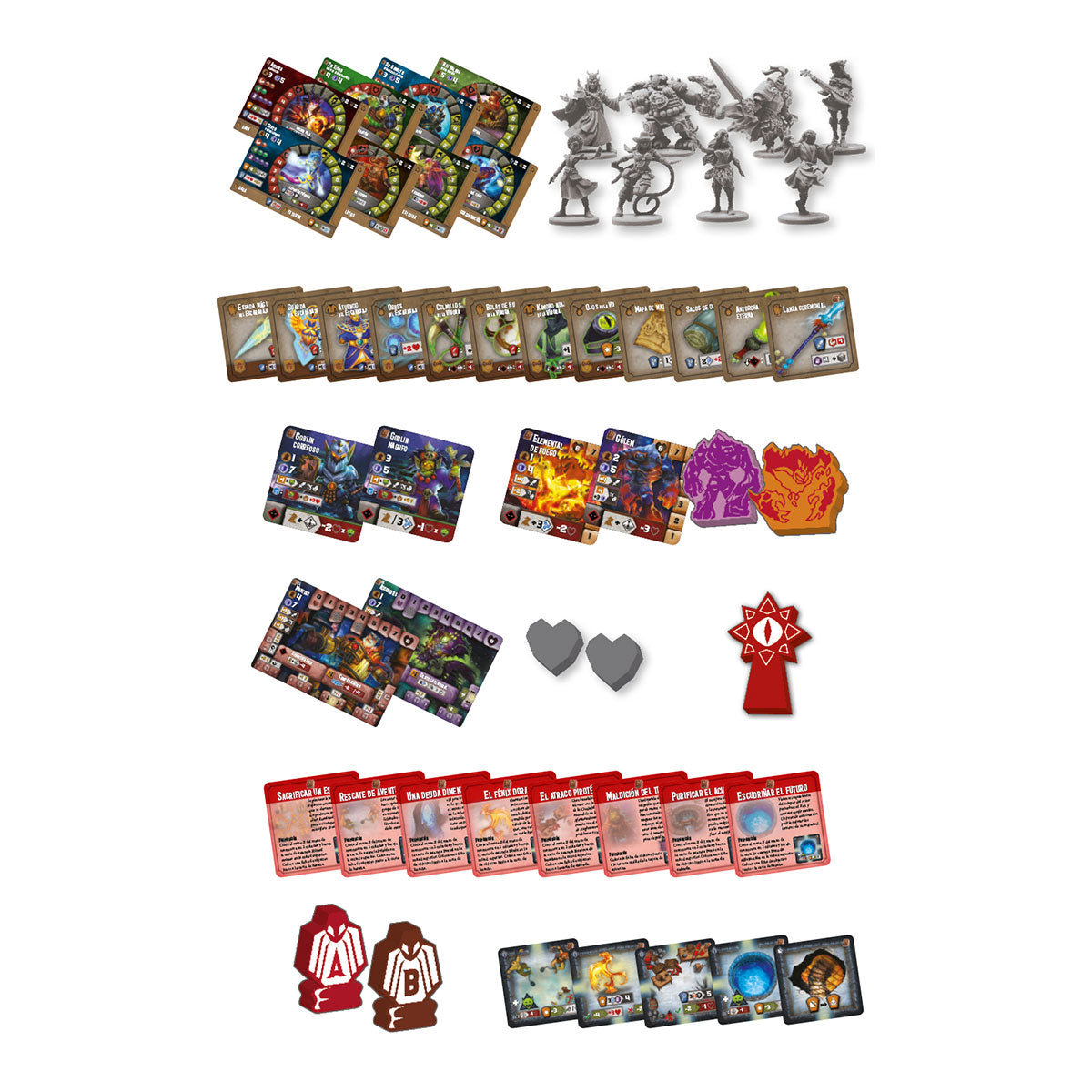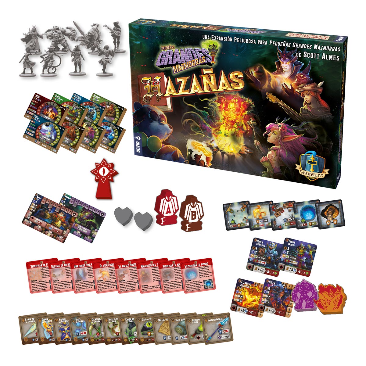 Pequeñas Grandes Mazmorras: Hazañas incluye dos nuevas dinámicas que multiplican las posibilidades del juego base. Por un lado, añade una serie de objetivos adicionales que el grupo debe completar antes de enfrentarse al jefe. Por el otro, aporta el modo de juego La mazmorra legendaria, un reto con 3 niveles de mazmorra distintos, ¡así como varios jefes! Además, esta expansión trae 8 nuevas miniaturas de héroe con sus tarjetas respectivas, nuevas cartas de botín y dos nuevos esbirros.